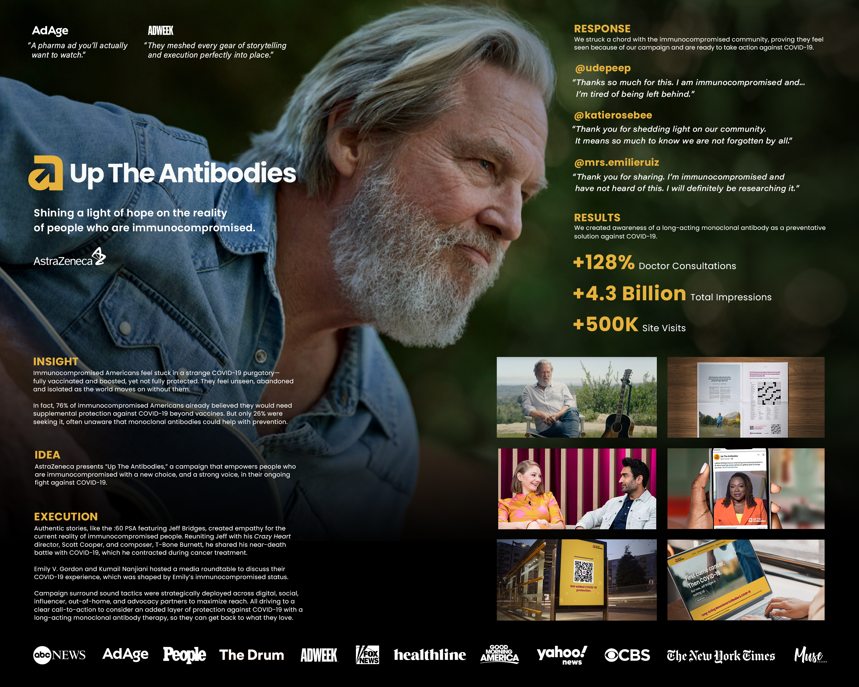 Immunocompromised Americans are already painfully aware of their COVID-19 reality. They feel unseen, isolated and forgotten, as if the world has accepted them as “collateral damage” for the sake of their own return to normal. Without a clear solution to explore, they are stuck. Our strategy was to help immunocompromised Americans feel truly seen in their COVID-19 reality and create awareness that an additional layer of protection is available to help. This strategy led seamlessly to our big idea: Up The Antibodies, a campaign that empowers them with a new choice, and a strong voice, in their ongoing fight against COVID-19. It’s a clear call-to-action linking the protection of a long-acting monoclonal antibody therapy to the hope of getting back to what they love. We surrounded immunocompromised Americans to earn their trust and inspire them to act with tactics including a 60 second PSA featuring Academy Award-winning actor Jeff Bridges, which ran on network/cable TV and was shared on Jeff’s social channels. Jeff recently discussed the fight of his life, first with lymphoma and then COVID-19, which he was exposed to in the time frame when he was receiving chemotherapy for cancer. It was fitting that, for this PSA, he was able to get back to doing what he loves with some of his favorite people – joining director Scott Cooper and music legend T Bone Burnett – for their first reunion since the making of 2009’s Academy Award-winning film, Crazy Heart. The impact of the overall campaign has been staggering. Jeff Bridges not only deeply resonated but sparked massive campaign awareness and action, with 86% of patients saying Jeff Bridges’ 60 second PSA resonated with how they have been feeling throughout the pandemic. With a heavy hand leant by Jeff’s video, a key component to the campaign, Up The Antibodies dramatically increased patient likelihood to speak with a doctor, with a 128% increase in immunocompromised Americans who have spoken to their doctor about long-acting antibodies.