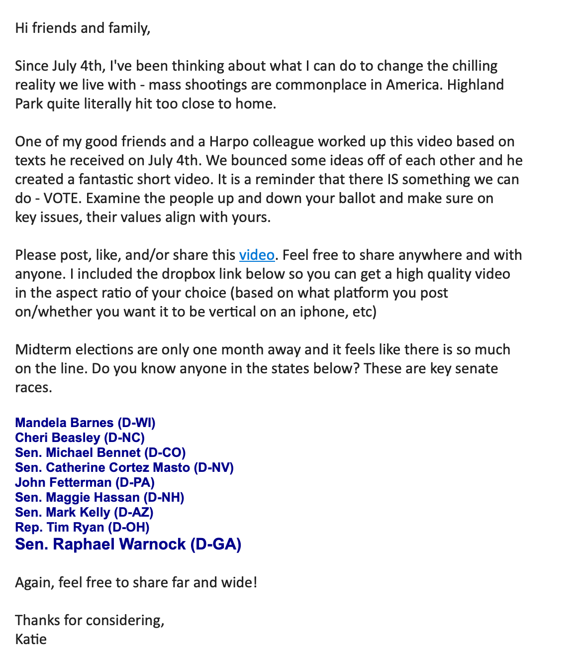 This is a project that I wrote and edited which is very close to home. I grew up in Highland Park, IL, and last year on the 4th of July the community suffered a mass shooting at the parade during what should be a celebration of people and America. This :30 was created as a social media response to encourage people to vote for candidates that support the assault weapon ban.