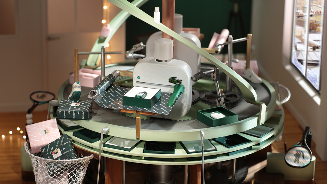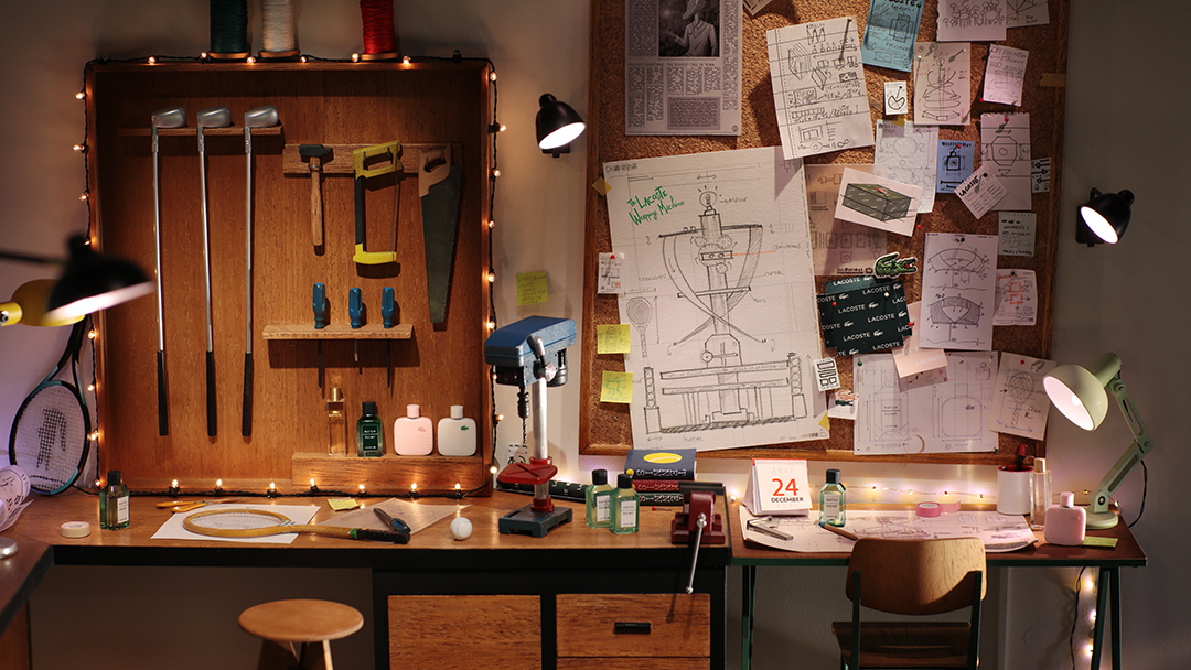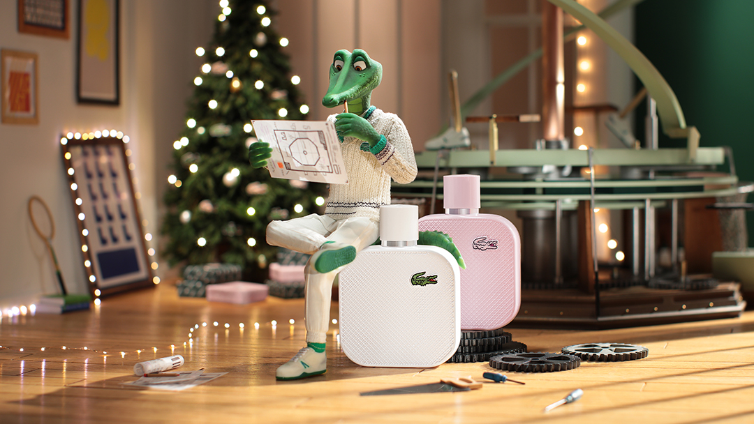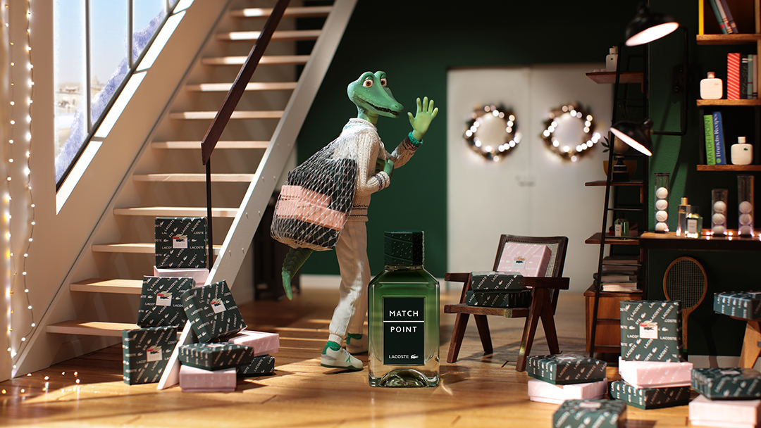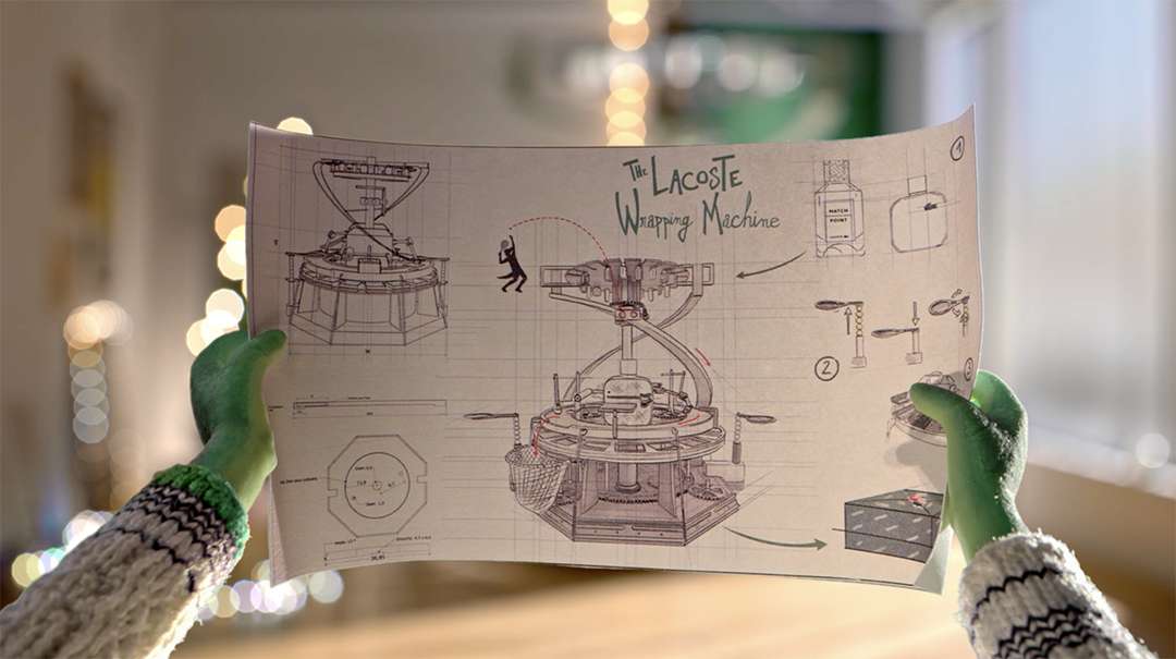 LACOSTE ASKED US TO IMAGINE THEIR XMAS CAMPAIGN : WE FLAUNT LACOSTE ICONIC CROCODILE IN AN INGENIOUS ORIGINAL ANIMATED SHORT FILM ! LACOSTE celebrates the end‑of‑year festivities by showcasing its trademark crocodile in animated format. The film takes place on Christmas Eve in a setting that brings to mind a Parisian roofspace workshop. The viewer is plunged into the animated world of Crocodile, a reincarnation of René Lacoste. Seated at his desk, Crocodile has just completed his latest invention: the marvellous Lacoste Wrapping Machine. In a precise, elegant sweep of the hand, he sends a tennis ball soaring to the other side of the room to trigger the mechanism and activate the device for wrapping up LACOSTE fragrances. FOR THE FIRST TIME IN LACOSTE HISTORY, THE ICONIC CROCODILE COMES TO LIFE ! We imagined a contemporary, whimsical reincarnation of brand creator René Lacoste. It tooks two months to construct the articulated Crocodile figurine. We had to create a skeleton, sculpted it, moulded it, cast it in silicone and hand‑painted it. The clothing was also all made by hand. A STUNNINGLY REALISTIC ANIMATED WORLD : The decor was a painstakingly precise task, involving the creation of miniature 1/7 scale figures of each element in the film. A METICULOUS UNDERTAKING : We produced the whole film in stop motion animation. To bring Crocodile’s story to life inside a 30‑second film, 750 photos had to be carefully selected and assembled, each one setting in motion the gestures and expressions of the protagonist and his extraordinary machine. With each day of work culminating in three seconds of film, fifteen days were required to capture all the photographic content. This was a precise, rigorous task that used a blend of tenacity and daring, in step with the brand’s values. THE WRAPPING MACHINE Our hero????has just completed his latest invention, which is a machine for wrapping his favourite gifts, namely, Lacoste fragrances! His contraption has been built following the aesthetics of one of Leonardo da Vinci’s gadgets and a Rube Goldberg machine, all cobbled together with Lacoste sports and tennis accessories.