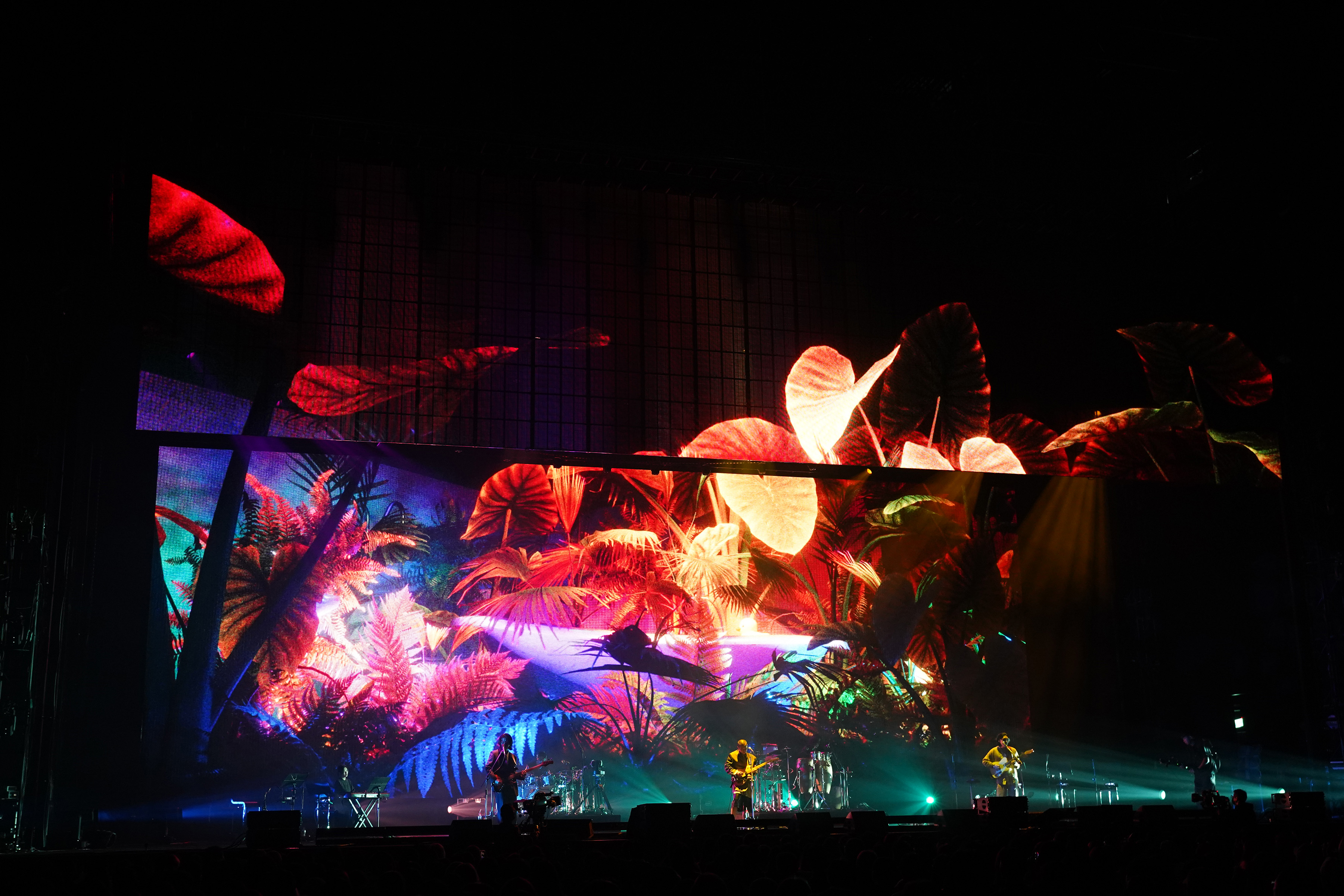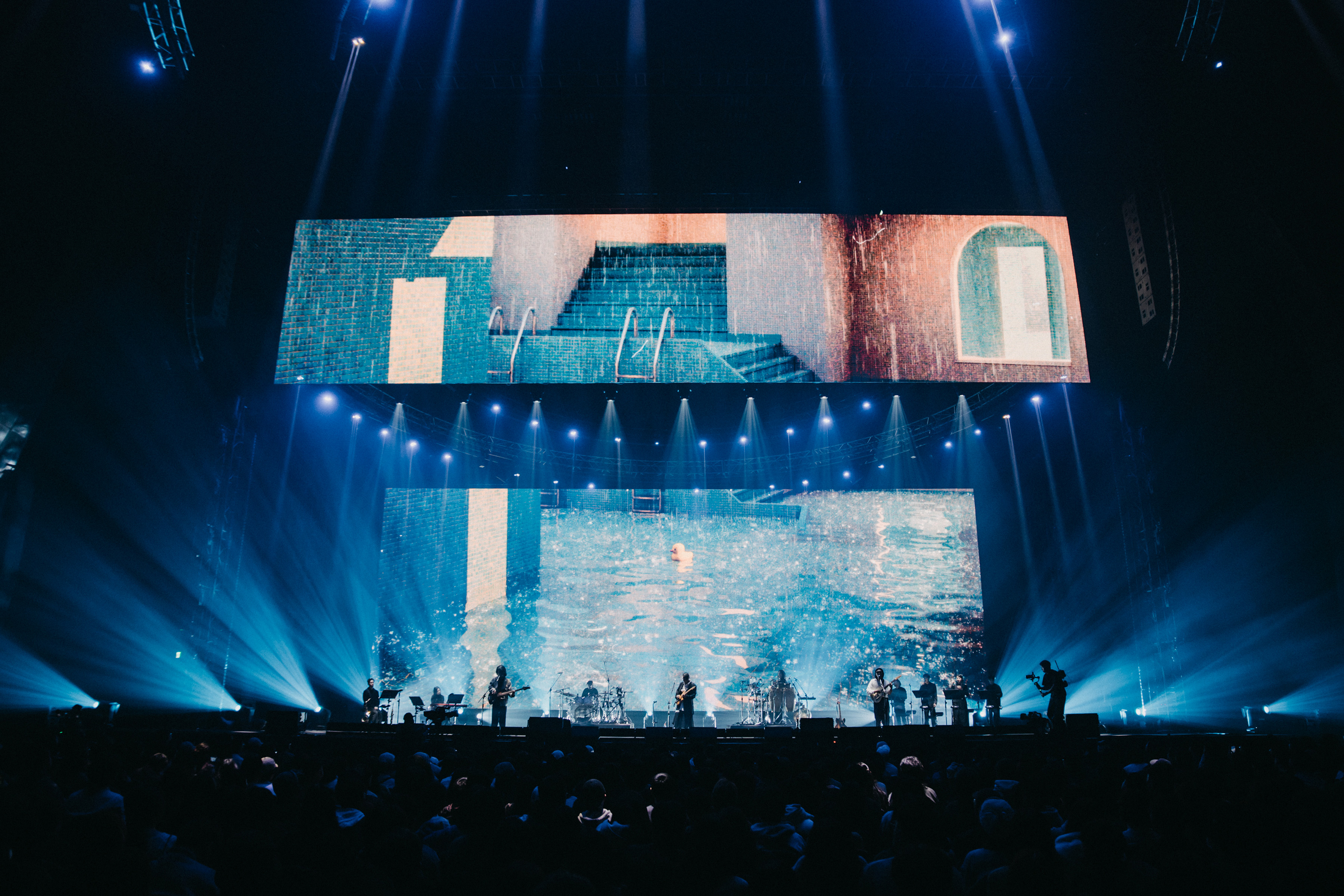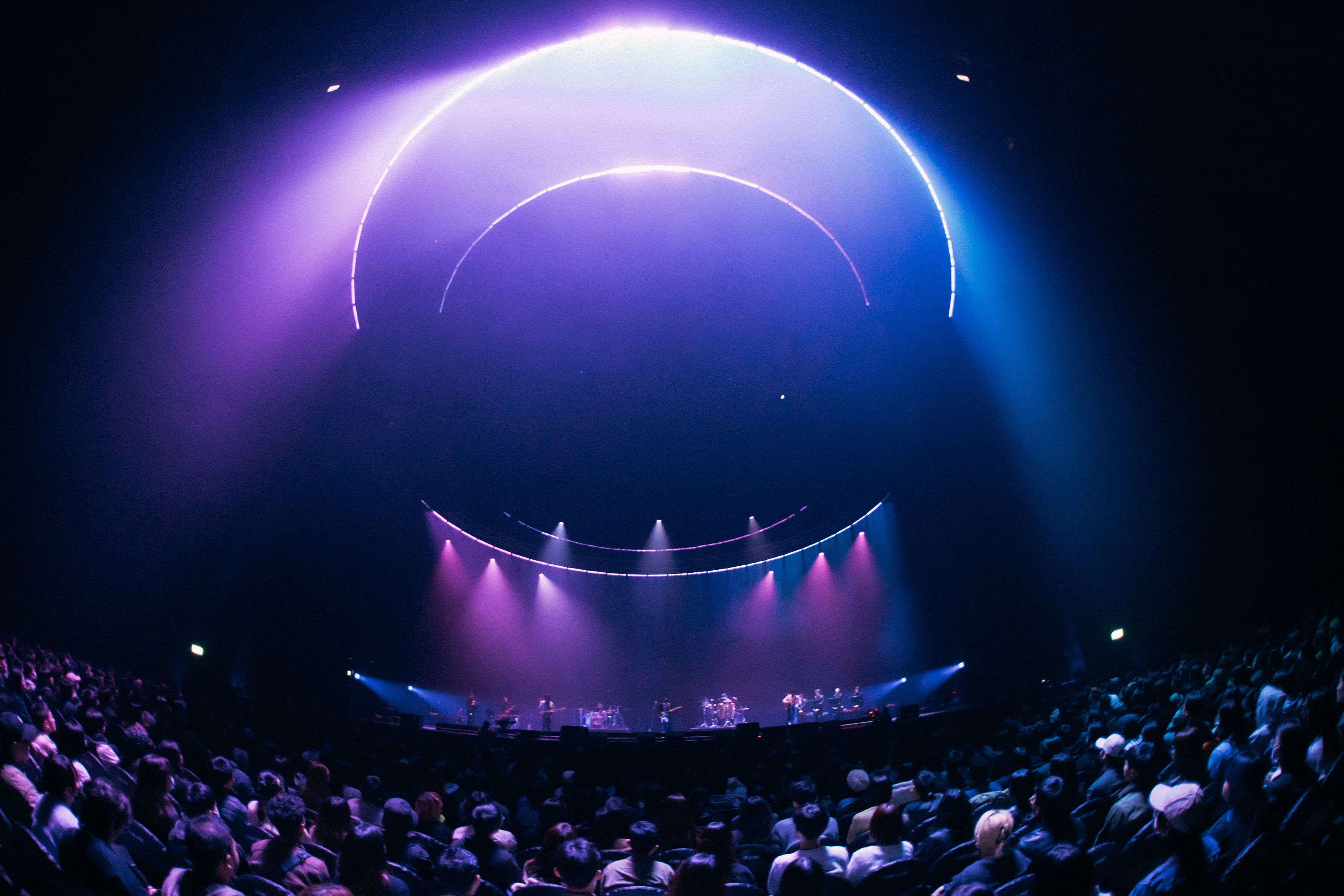 The concert theme "Heaven & Dirt" is from deca joins' latest album, describing how we would spend our time when we have different encounters on the journey of life. The "Round Sky and Square Earth" was the first imagination of the world by ancient people. Although it was eventually proved to be a fallacy, it is a testimony to humankind's repeated experiments and explorations, and their desire to validate their own worldview. This spirit echoes the perspective of life in the songs, and is the basis for the design concept of the concert. The cycle of "water", the main element of deca joins' creation, leads the audience to experience their own repeated experiments and explorations. In response to the theme of this concert, the stage design transformed "Round Sky and Square Earth" into a physical symbol, using circular lighting structures to form the main space on the top, and rectangular LED screens to depict the ground. The focus is on how to give the audience an impressive yet simple and powerful visual experience. At the huge circular lighting structure, we try to add a mellow lighting gradation in the lighting design, as if it is the projection of light from the real celestial body's rotation. This huge circular structure is not only above the main stage, but also spans over the heads of the audience in the front area, so that the lighting atmosphere can be more integrated and penetrated into the audience, so that the whole area is immersed in the context of the performance. When the audience entered the venue, they could see a rectangular LED screen occupying the entire stage. When the show starts, the banner LED is pulled upwards, and another rectangular LED can be seen behind the band, so that the artists can be visually covered by the image, and at the same time, the stage has different levels of variation. Because deca joins' music is characterized by unimaginable arranging details, so we put the music first when integrating all the designs, eliminating the essentials, making everything more comprehensible and touching the audience’s heart directly.