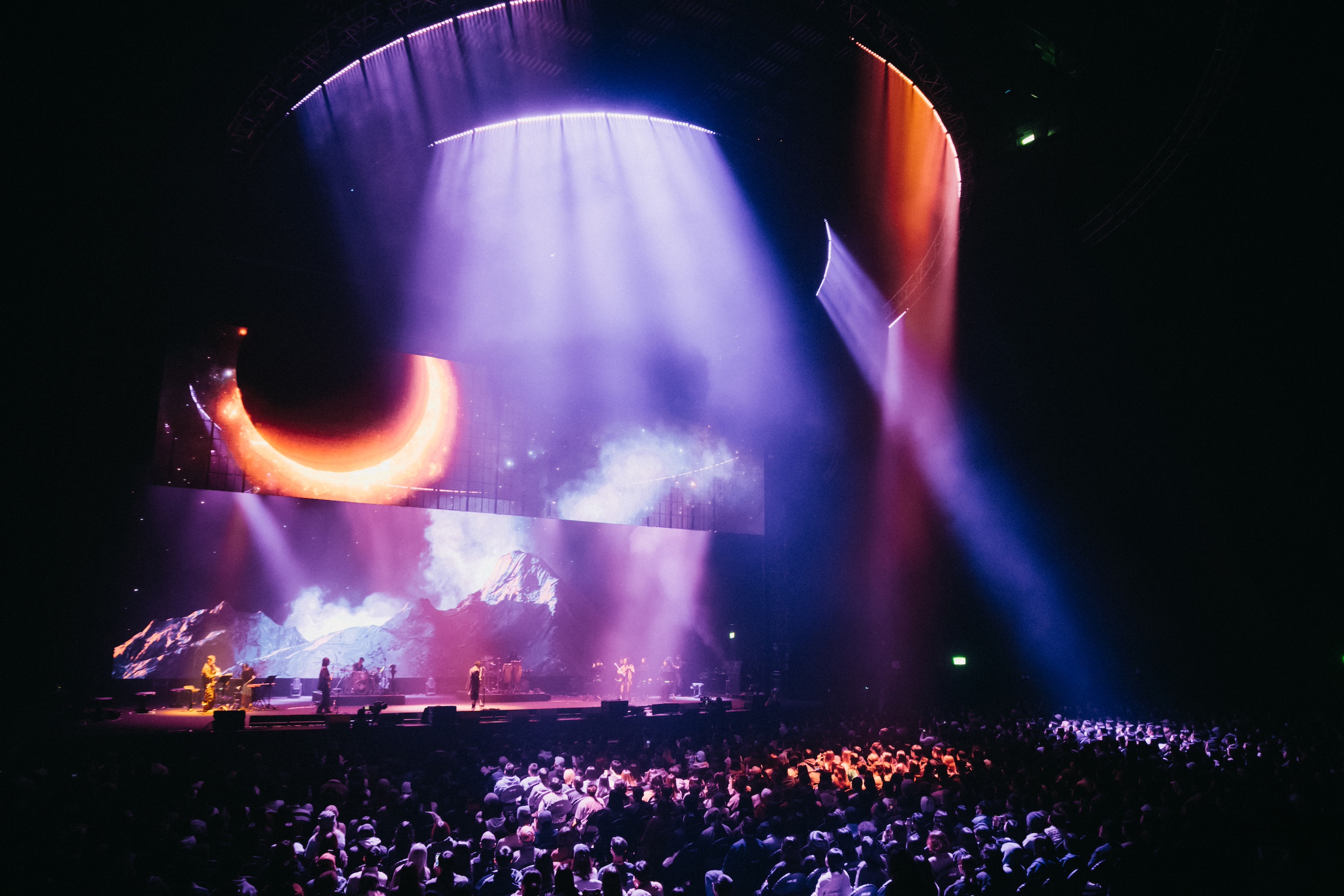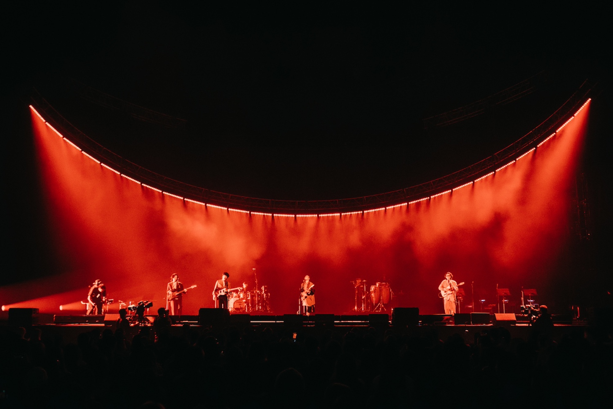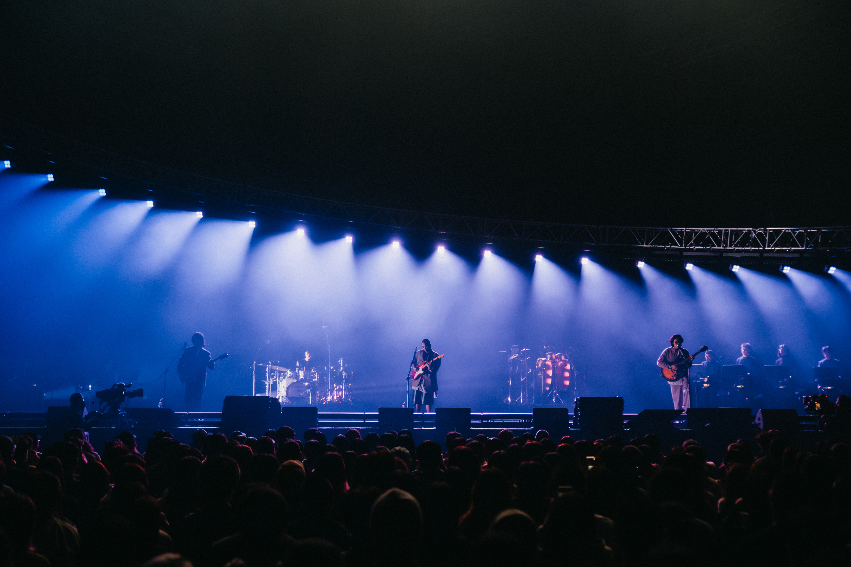 The concert theme "Heaven & Dirt" is from deca joins' latest album, describing how we would spend our time when we have different encounters on the journey of life. The "Round Sky and Square Earth" was the first imagination of the world by ancient people. Although it was eventually proved to be a fallacy, it is a testimony to humankind's repeated experiments and explorations, and their desire to validate their own worldview. This spirit echoes the perspective of life in the songs, and is the basis for the design concept of the concert. The cycle of "water", the main element of deca joins' creation, leads the audience to experience their own repeated experiments and explorations. In response to the theme of this concert, the stage design transformed "Round Sky and Square Earth" into a physical symbol, using circular lighting structures to form the main space on the top, and rectangular LED screens to depict the ground. The focus is on how to give the audience an impressive yet simple and powerful visual experience. At the huge circular lighting structure, we try to add a mellow lighting gradation in the lighting design, as if it is the projection of light from the real celestial body's rotation. This huge circular structure is not only above the main stage, but also spans over the heads of the audience in the front area, so that the lighting atmosphere can be more integrated and penetrated into the audience, so that the whole area is immersed in the context of the performance. When the audience entered the venue, they could see a rectangular LED screen occupying the entire stage. When the show starts, the banner LED is pulled upwards, and another rectangular LED can be seen behind the band, so that the artists can be visually covered by the image, and at the same time, the stage has different levels of variation. Because deca joins' music is characterized by unimaginable arranging details, so we put the music first when integrating all the designs, eliminating the essentials, making everything more comprehensible and touching the audience’s heart directly.