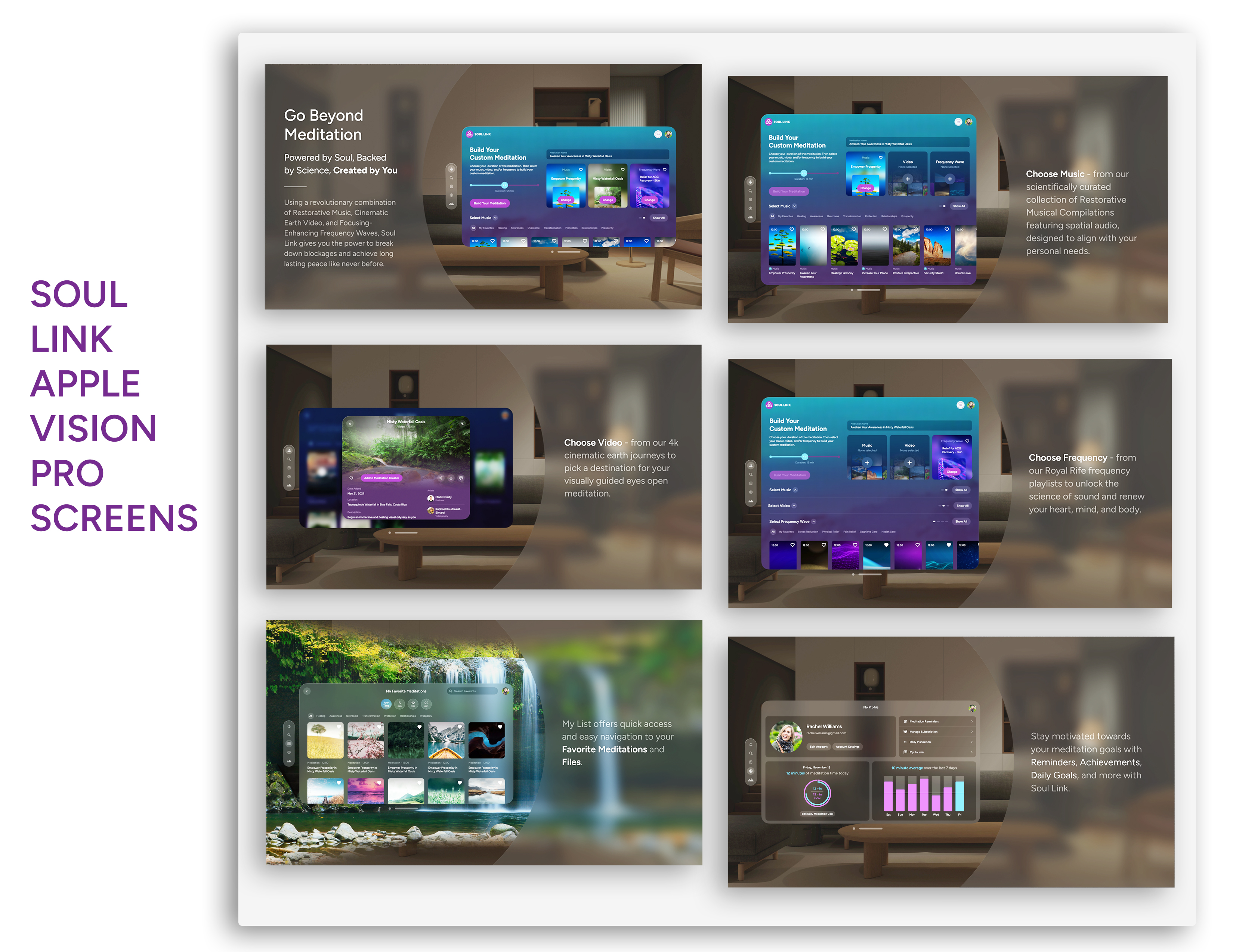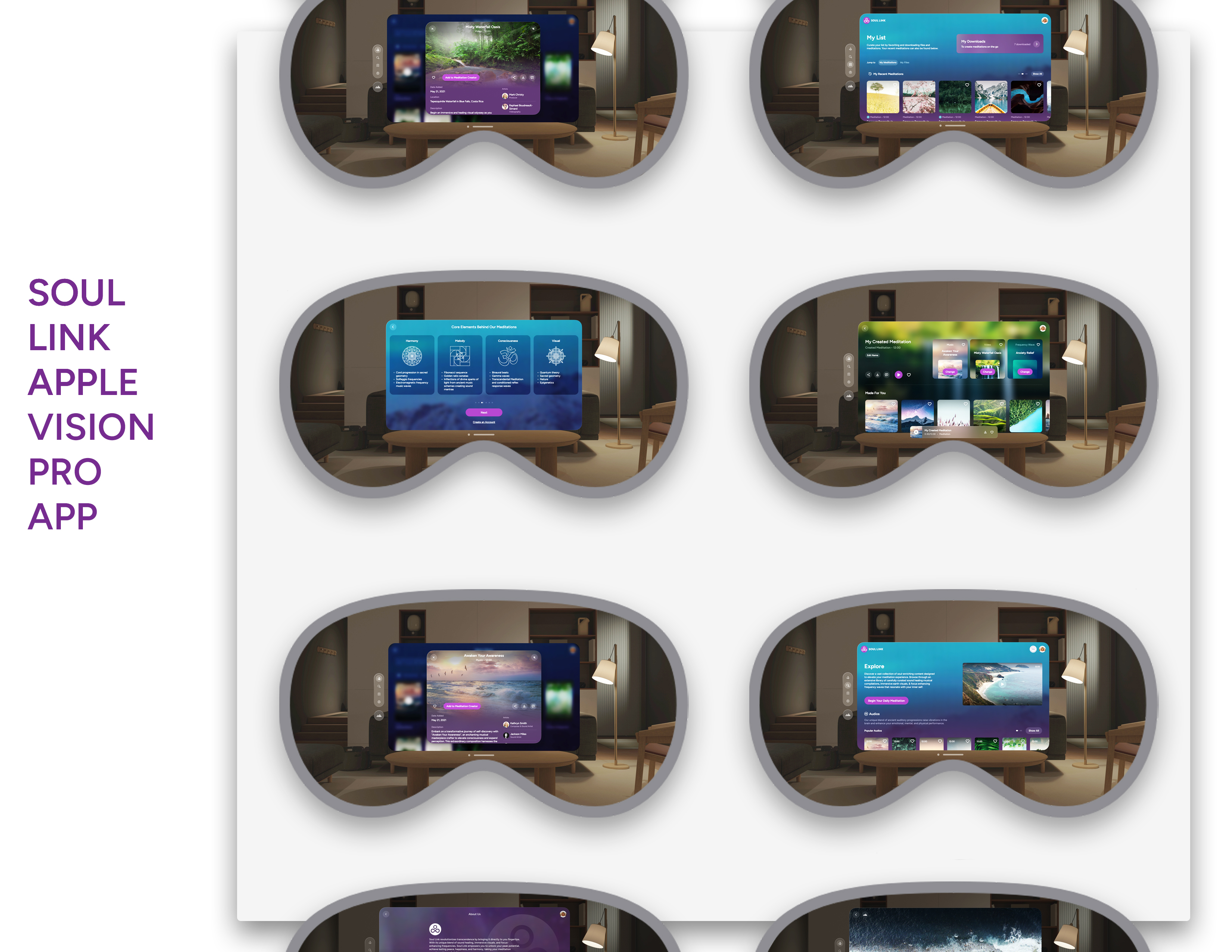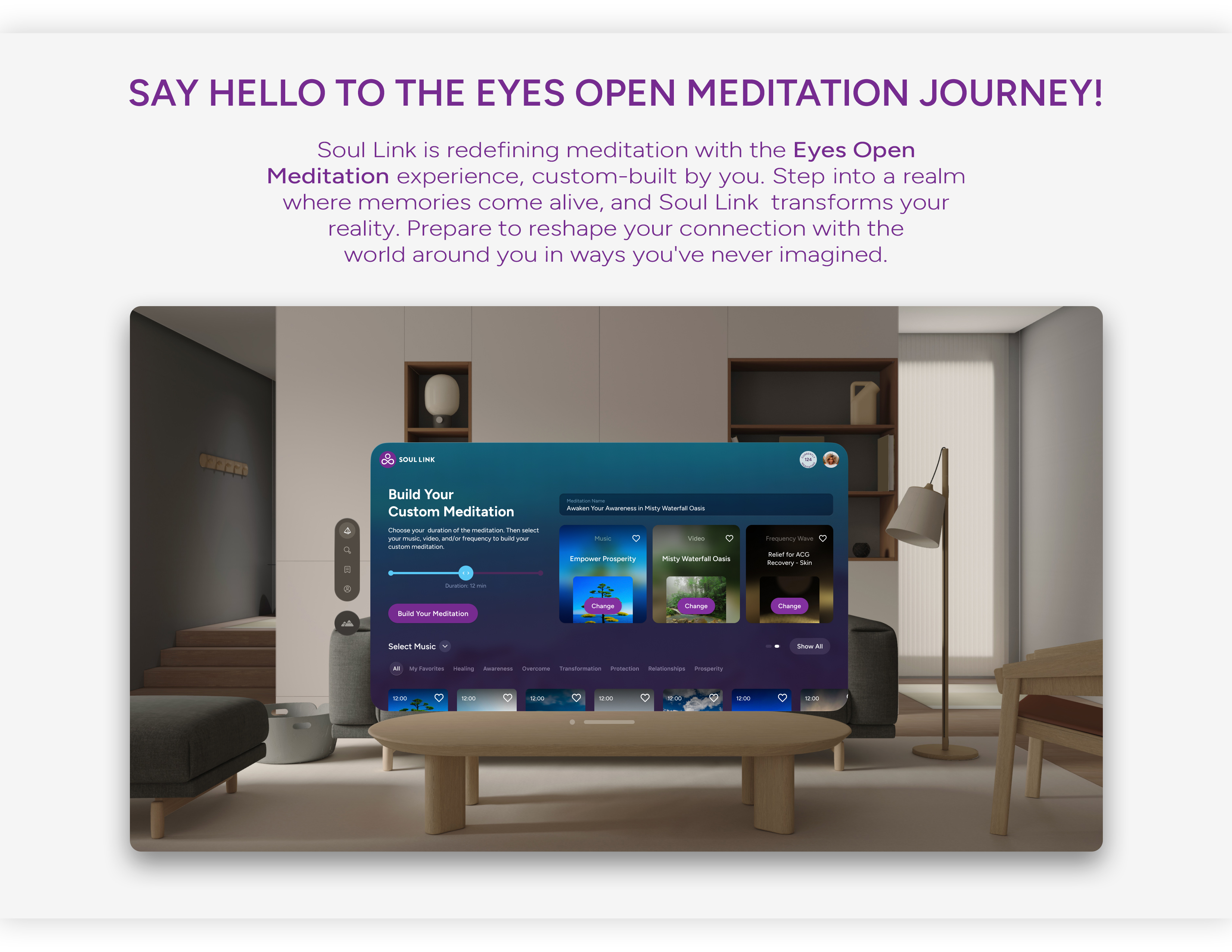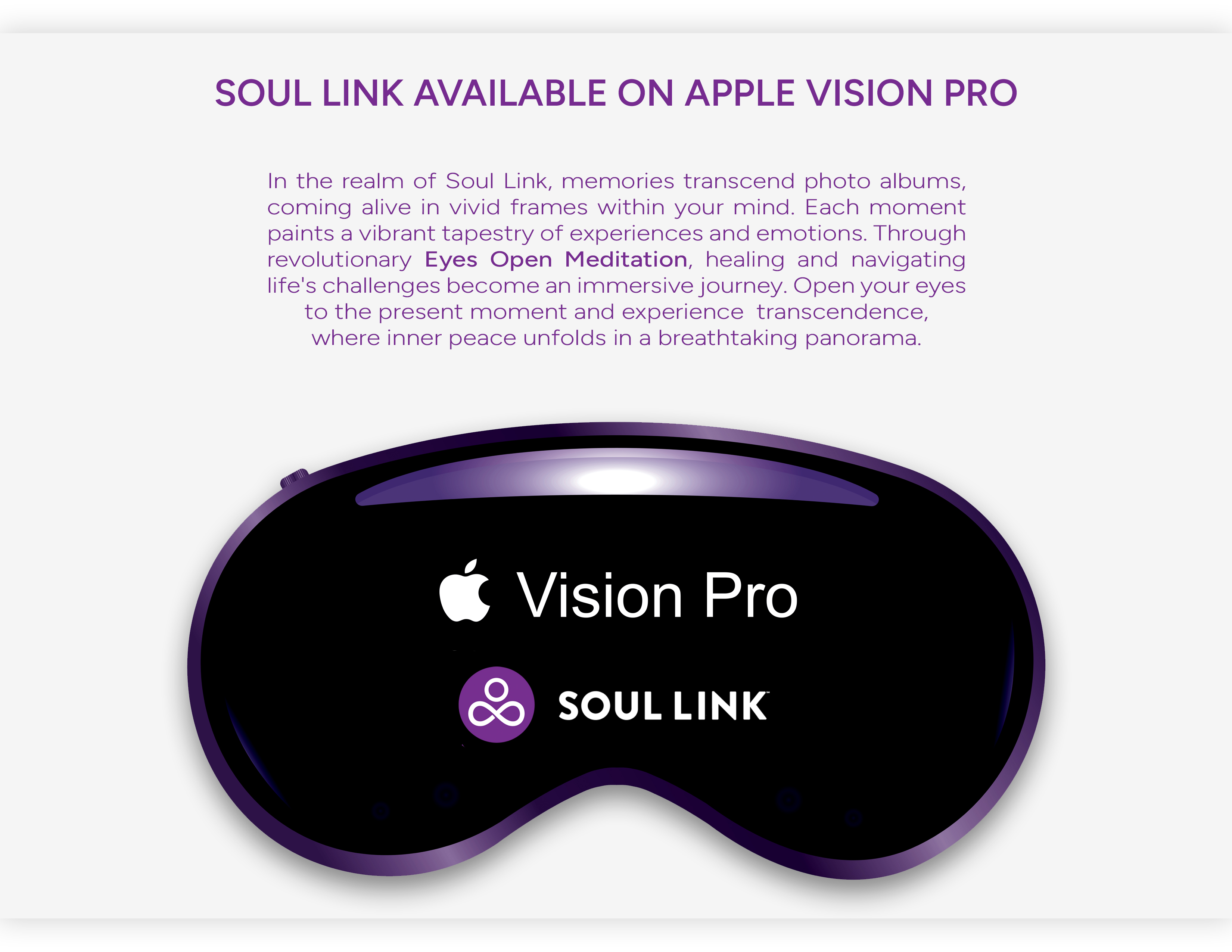Soul Link is more than just a product; it's a paradigm shift in holistic well-being. Now harnessing the power of Apple Vision Pro, Soul Link introduces Eyes Open Meditation, a revolutionary blend of technology and mindfulness. This innovative approach, supported by rigorous research, seamlessly integrates tranquility into daily life, empowering you to embrace serenity and foster transformative change with your eyes wide open. In a world filled with challenges like anxiety, stress, and health concerns, finding inner peace can feel elusive. What if there was a way to relieve stress, improve sleep, and boost both your physical and cognitive health? Soul Link on Apple Vision Pro offers that solution, enabling you to feel truly empowered in your life. Dr. Dawn Ella's innovative Soul Link meditation technology catalyzes self-discovery and inner growth. Grounded in extensive research on the mind-body connection and the impact of music on the brain, Soul Link fuses science and spirituality, redefining meditation and propelling users into a realm of self-discovery and transcendence. Restorative Musical Compositions: Soul Link music is crafted with sound healing techniques to facilitate positive changes in the brain and human consciousness. These compositions, now with spatial audio on Apple Vision Pro, serve as powerful catalysts for emotional regulation and mental wellness. Cinematic Earth Videography: Visual stimuli play a pivotal role in shaping our perceptions and experiences, grounding you in the present moment. These visual journeys trigger a calming response in the nervous system, fostering a profound connection with the Earth and your inner self. Focus-Enhancing Frequency Waves: These waves harmonize your brainwave patterns and bridge the conscious and subconscious, unlocking your untapped potential and elevating your state of being. Soul Link, now on Apple Vision Pro, transcends the boundaries of conventional meditation, offering a fully interactive experience. This innovative technology makes every moment feel real and present, bringing your meditation practice to life like never before. Soul Link emerges as a beacon of hope in mental wellness, epitomizing innovation and dedication. It’s not just a product; it's a pioneering journey into well-being, designed to improve lives through thoughtful design and cutting-edge technology.