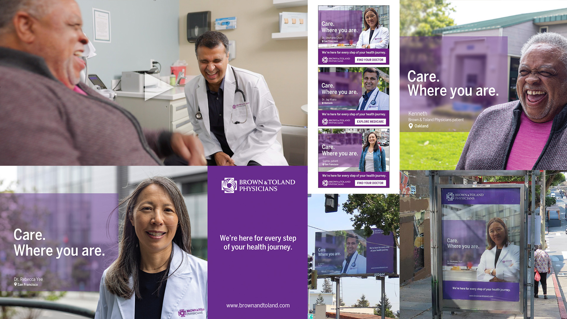 THE CHALLENGE Brown & Toland Physicians is a network of independent physicians in the Bay Area. They looked to create a campaign in 2021 that would reflect not only the level of care that they provide patients of all ages, but also the benefits of seeing a doctor that you can form a relationship with to establish a continuity of care for years to come. This is a stark contrast to the trend of the “quick-serve” approach of the large-scale healthcare systems that are growing throughout the area. The campaign needed to represent the connection that Brown & Toland physicians have with their patients, their dedication to innovative medicine, and the strength of their network to deliver quality care across all disciplines and specialties. THE STRATEGY The campaign would take multiple forms to ensure it was speaking to the right audience at the right time. Segmentation included dividing the campaign between an overarching Commercial healthcare audience and a more specific Medicare target group. MEDIA In order to achieve an optimal reach and frequency in the Bay Area, our media plan included broad outreach that would cast a wide net of brand amplification, as well as local marketing opportunities to influence the target at a county level. In a true multi-channel and integrated effort, our media team surrounded the Bay Area consumer using television, connected TV (OTT), radio, out-of-home, social media, online display/video, paid search, and native advertising. CREATIVE “Care. Where you are.” Community was a theme that our creative team identified as an important element to get the attention of our target audience and to highlight the uniqueness that Brown & Toland provides their patients. We aimed to show the doctors in their communities and represent the patients and their personalities, which people would relate to. THE PRODUCTION Brown & Toland identified 12 doctors who were available to participate in the production of the ad campaign. Coordinating shoots at separate offices, including capturing outdoor scenes, required a challenging choreography of schedules and creative shot list; however, ensuring the doctors and patients were safe from COVID-19 was a top priority.